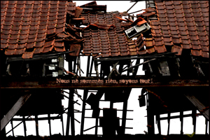 lourd et gris. Le toit gît défait en morceau sur le sol et