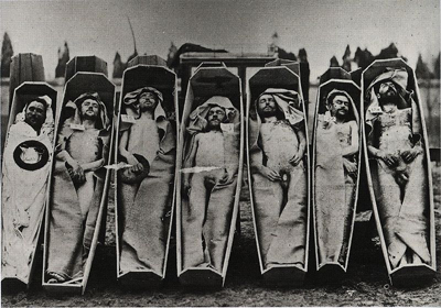 "On tuait partout, on tuait sans trêve. C'était le délire du massacre, et ces sanglantes saturnales allaient se prolonger pendant quatre jours à la lueur des maisons enflammées. C'est par milliers que les cadavres des "fusillés en masse" s'entassaient dans les rues des Abbesses, Lepic, des Poissoniers, au Moulin de la Galette, au Château-Rouge. Le 28 mai on vidait l'immense fosse commune creusée au milieu de la place. Les cadavres, à moitié décomposés, étaient chargés dans des tapissières. Tous les spectateurs étaient pleins d'effroi. Une jeune fille qui assistait à ce spectacle dit : j'en ai vu bien d'autres, dans un trou on a fourré 150 gardes nationaux". (Récit d'un témoin)
