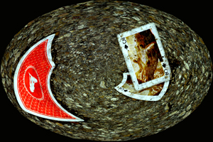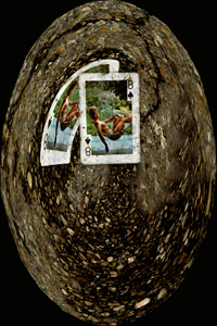 L’action se passe sur une réderie par une journée pluvieuse. Après qu’il eut trouvé sur un stand un jeu de cartes fripon des années 60, le petit Poucet un peu cochon, enveloppé dans un grand imperméable, le mis dans sa besace pour le contempler tranquillement plus tard. Le vice étant mal récompensé, les cartes,comme les petits cailloux du conte, s’échappèrent une à une par un trou dans le fond du sac.. La dernière carte retrouvée ne donna aucune indication sur la suite de cette « walk on the wild side » …On ne sut jamais s’il se rendit compte de la disparition de ces images et qu’il n’osa pas faire marche arrière pour les récupérer ou s’il eut la mauvaise surprise en arrivant chez lui, en poussant un immense Damned ! de désespoir.